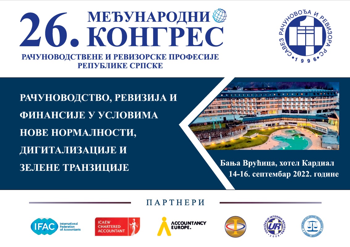 Савез рачуновођа и ревизора Републике Српске организује 26. Међународни конгрес рачуноводствене и ревизорске професије Републике Српске под називом: „РАЧУНОВОДСТВО, РЕВИЗИЈА И ФИНАНСИЈЕ У УСЛОВИМА НОВЕ НОРМАЛНОСТИ, ДИГИТАЛИЗАЦИЈЕ И ЗЕЛЕНЕ ТРАНЗИЦИЈЕ“, који ће бити одржан у Бањи Врућици – хотел Кардиал 14., 15. и 16. септембра 2022. године.